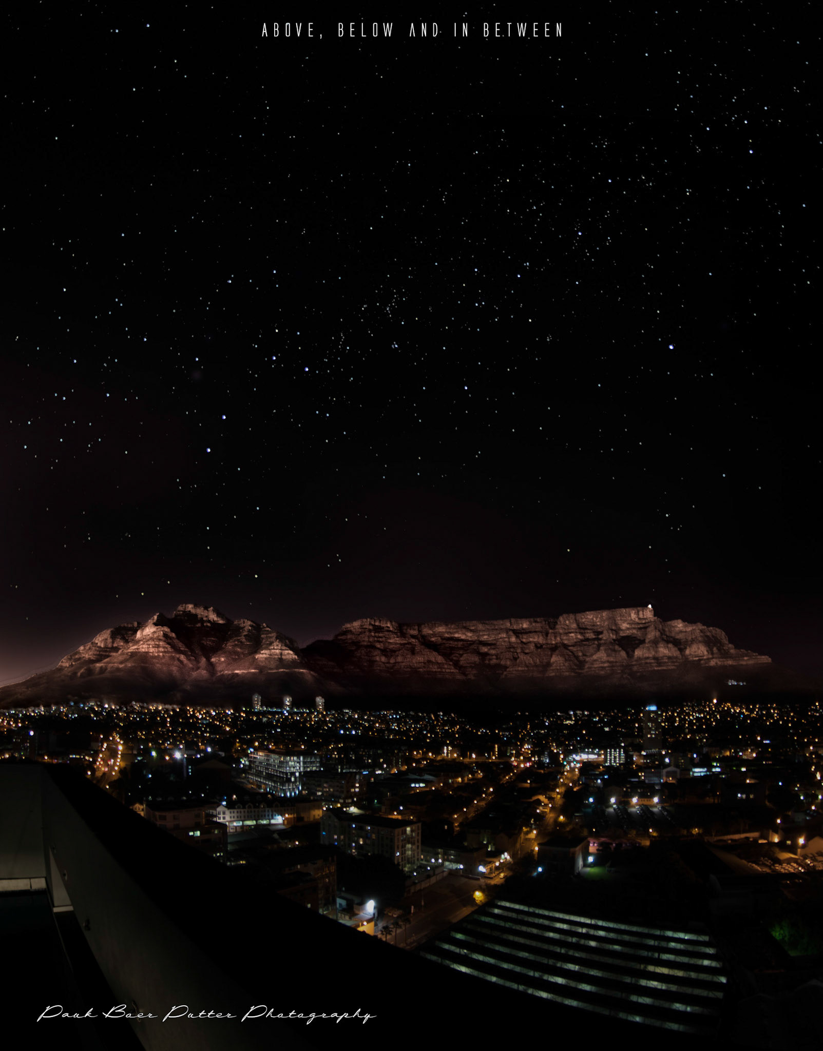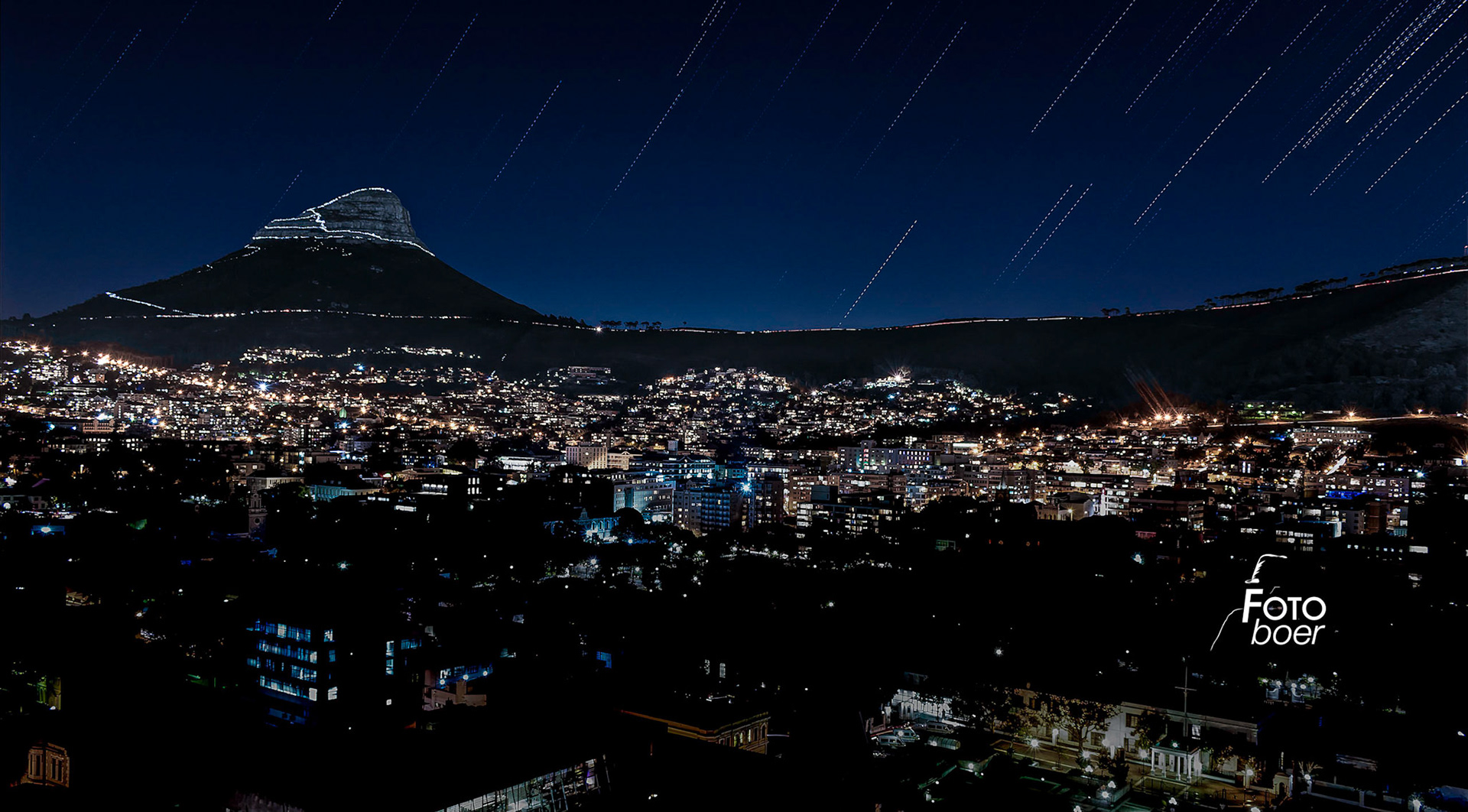 Every full moon hundreds of people climb Lion's Head. Cape Town, to watch the moonrise. After moonrise they walk down various paths, creating a shimmering necklace around the mountain as the rising moon catches the mountain. This image is a composite of 40 20 second exposures, captured over an hour or so. The dotted line star trails are caused by gaps between captures